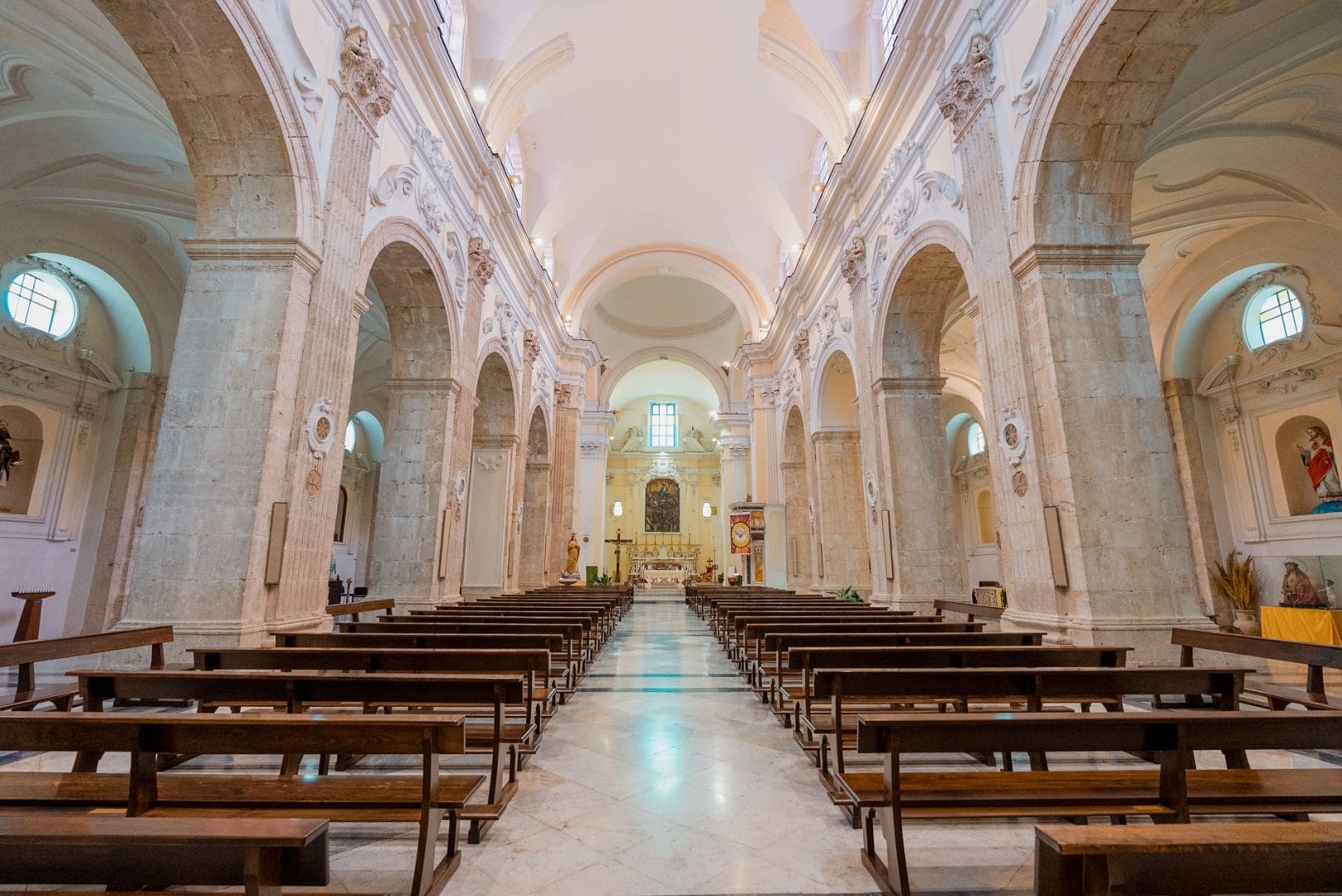 Dalla navata centrale si apre una prospettiva teatrale che culmina nel presbiterio, dove domina la pala d’altare raffigurante la Madonna della Pace, protettrice della città e simbolo di riconciliazione.