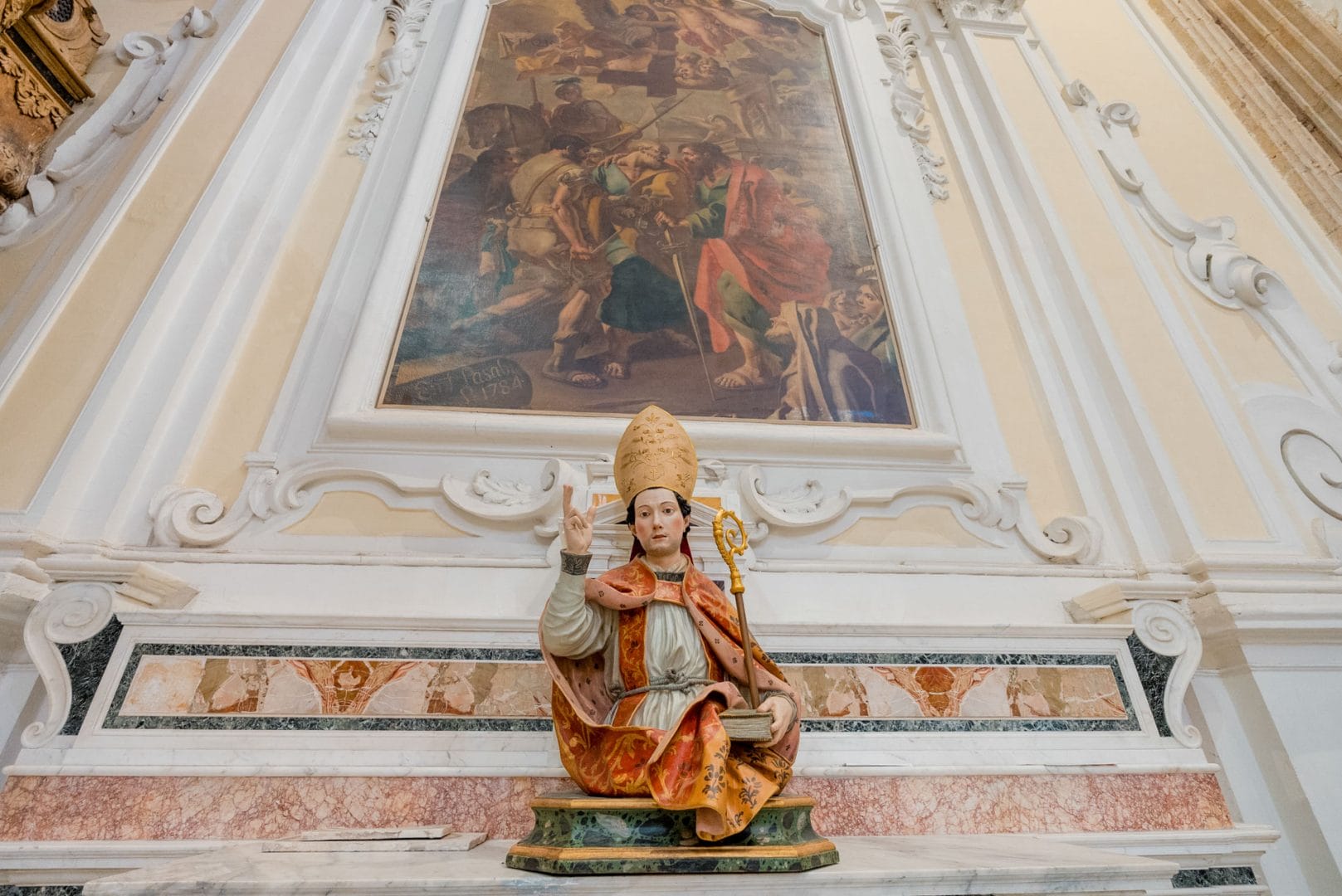 Nel corso del Settecento la chiesa fu ulteriormente arricchita: vennero realizzate le cappelle laterali, le decorazioni a stucco e gli altari in marmo, mentre la facciata assunse l’aspetto attuale, scandito da colonne corinzie e statue di santi collocate in eleganti nicchie. Ogni dettaglio è pensato per comunicare la solidità della fede e la dignità della città.