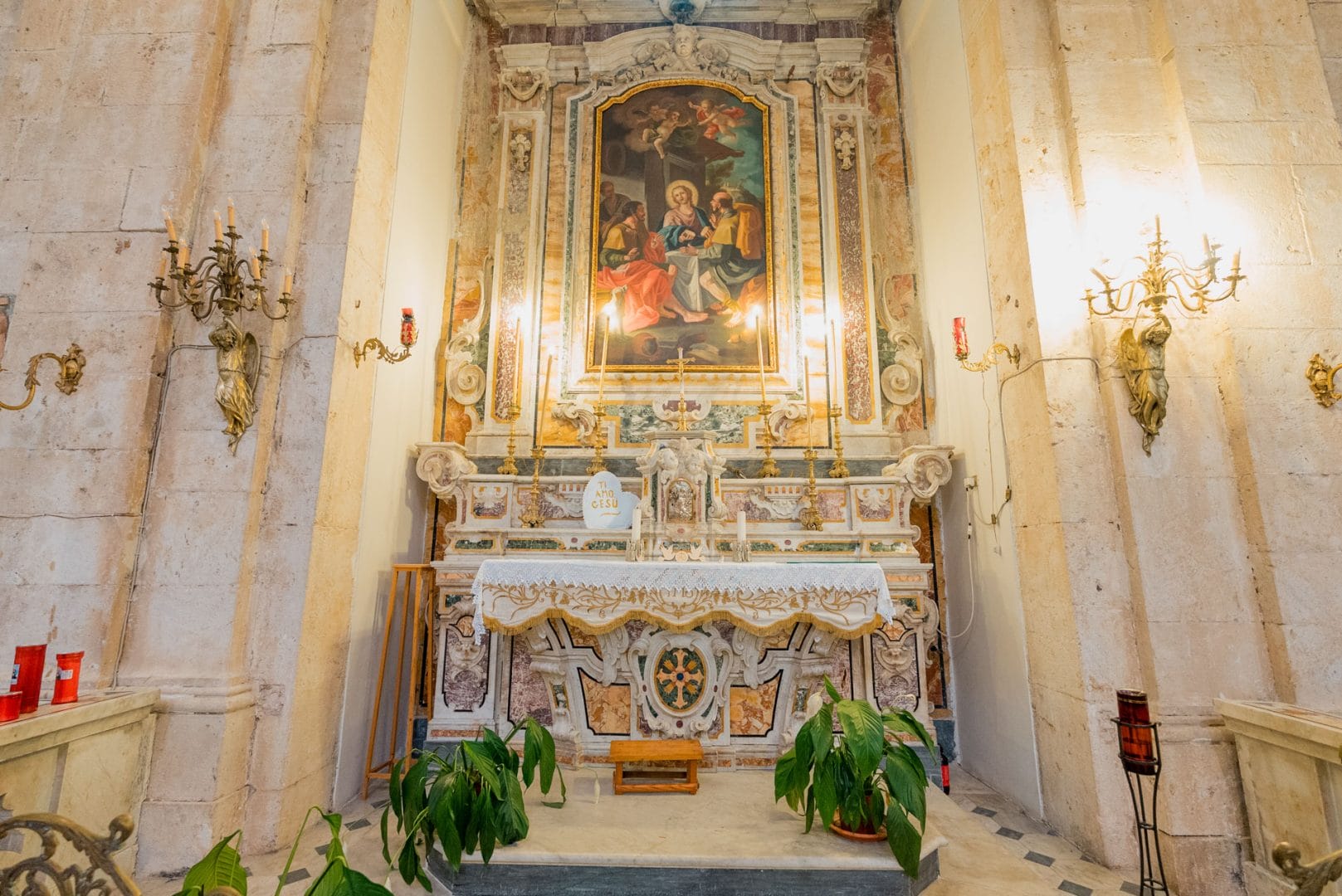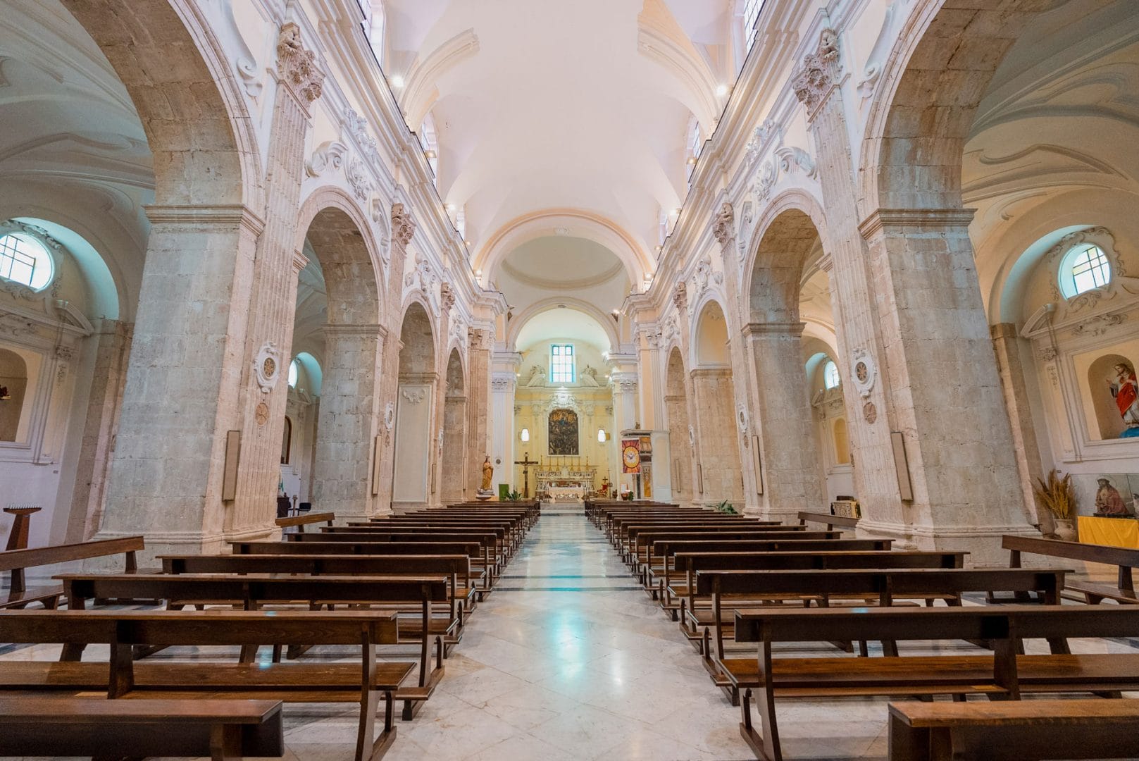 L’interno, a croce latina, custodisce un patrimonio artistico di grande rilievo: marmi intarsiati, altari laterali decorati da maestranze locali, un maestoso organo ligneo e una cupola che diffonde luce dorata sulle navate.