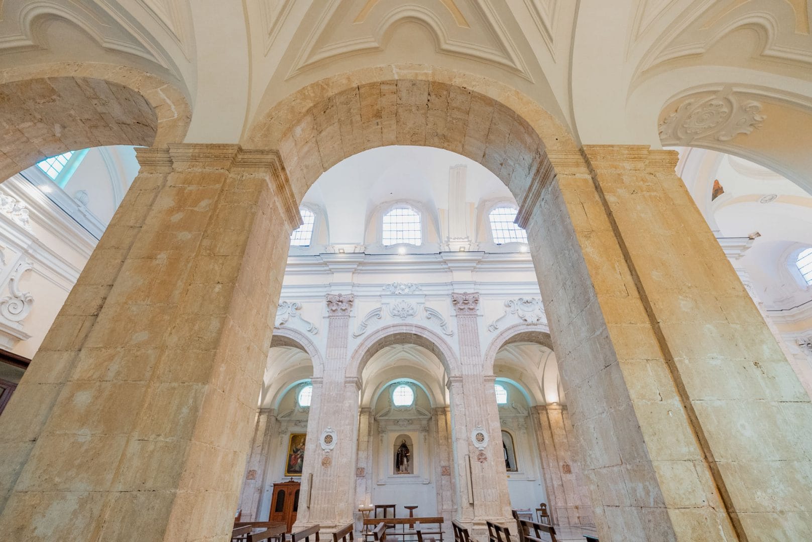 Le navate sono scandite da pilastri possenti e da arcate che conducono lo sguardo verso la cupola, punto focale di un sistema luminoso progettato per esaltare la centralità del presbiterio.