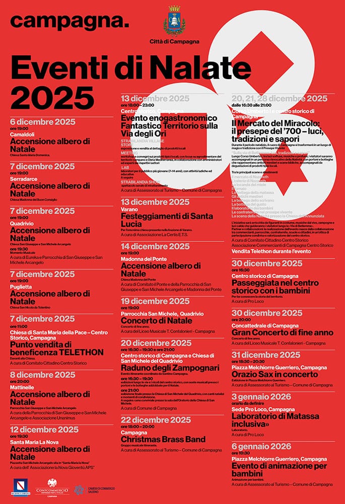 Il periodo più atteso dell’anno è alle porte e Campagna è pronta a illuminarsi di appuntamenti, tradizioni, musica e momenti di comunità. Il calendario raccoglie nel dettaglio tutte le iniziative dal 6 dicembre 2025 al 6 gennaio 2026: accensioni degli alberi di Natale nelle frazioni, concerti, mercatini, animazione per i più piccoli, il Presepe Vivente e gli eventi enogastronomici.